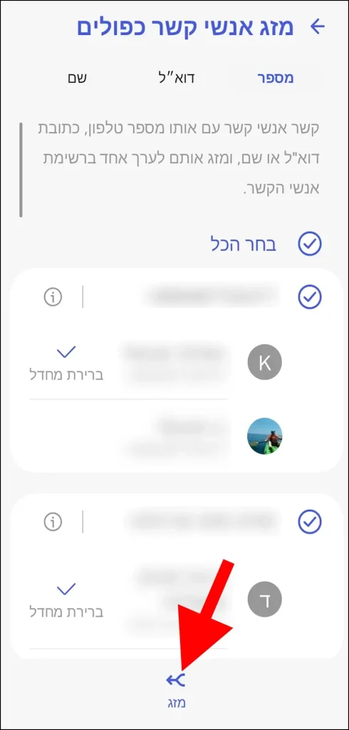 תוכלו לסמן אחד אחד ולמזג אותם, או ללחוץ על האפשרות "בחר הכל" כדי למזג את כל אנשי הקשר הכפולים בבת אחת.